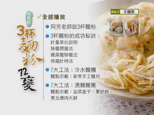 阿芳老師的廚房教室-3杯麵粉72變 第1集 (阿芳老師教你從3大麵類、7大工法出發輕鬆變出72道新鮮、健康、無人工添加的麵點)(DVD一片裝)